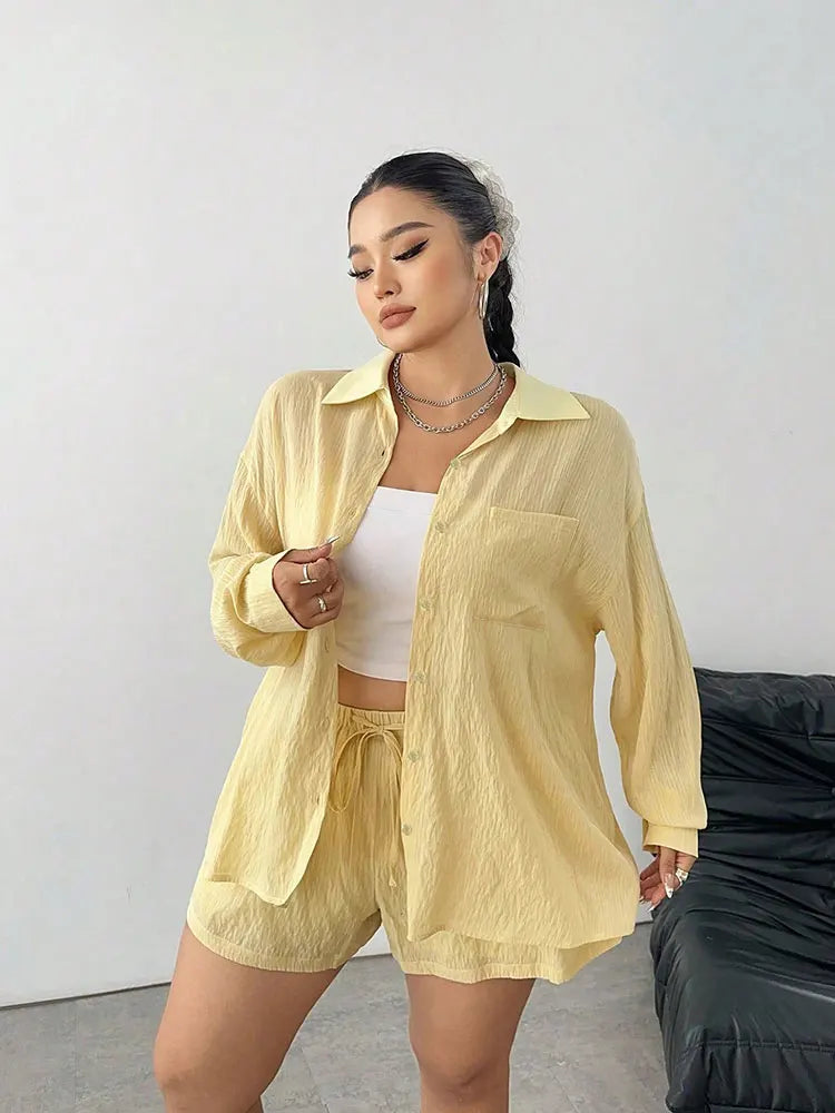 O Conjunto Plus Size Edição Limitada combina uma camisa amarela elegante com bolsos e modelagem soltinha, e um short com cinto oculto que valoriza a silhueta sem perder o conforto.