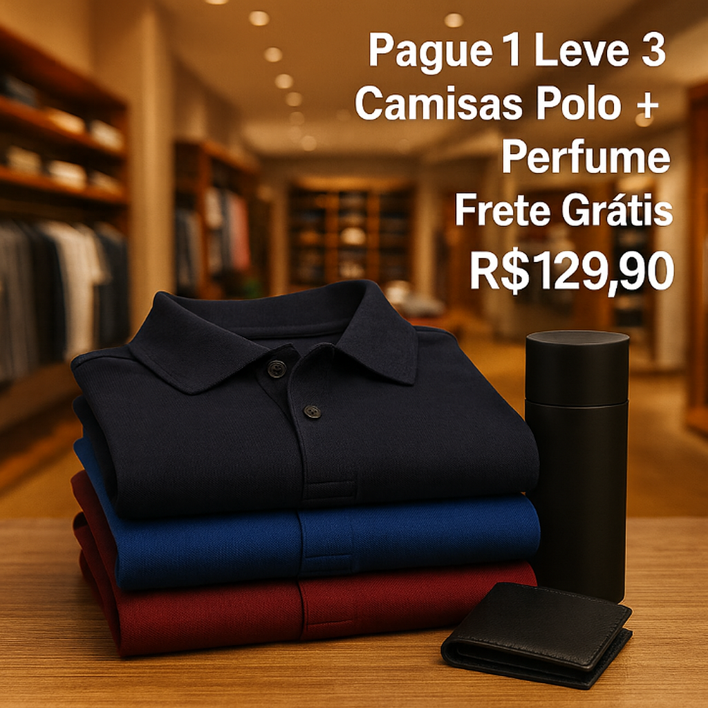 đ„ Pague 1, Leve 3 Camisas Polo + Perfume Exclusivo â R$129,90!